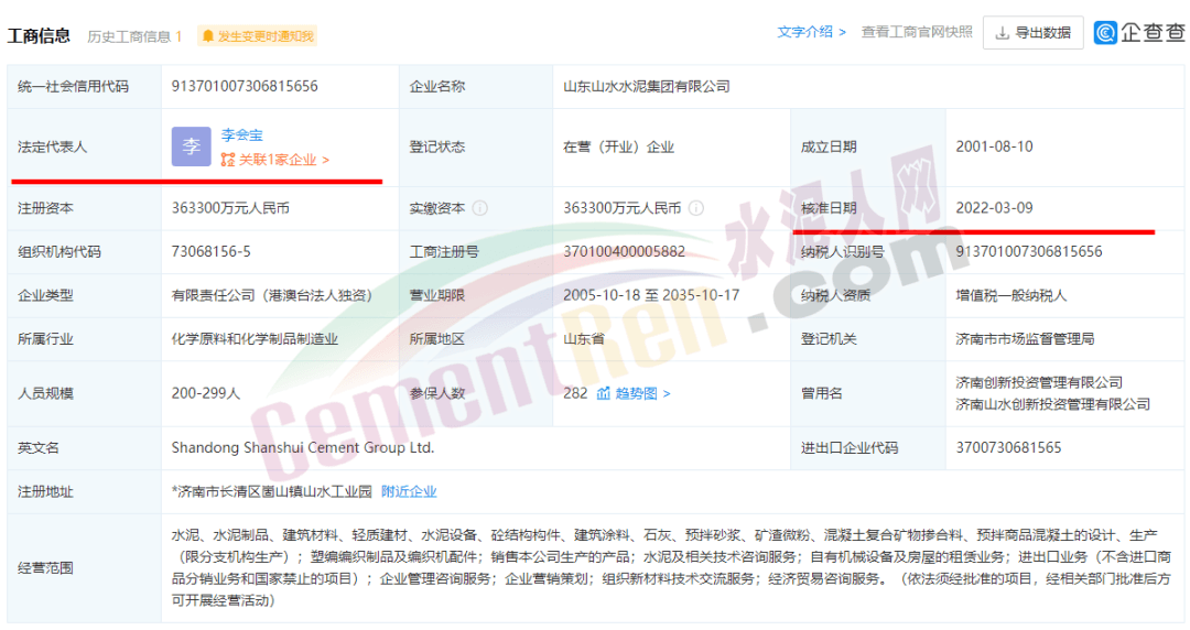 3月10日, 山東山水水泥集團(tuán)有限公司(以下簡(jiǎn)稱“山水水泥”)主要成員發(fā)生變更,法定代表人從常張利變更為李會(huì)寶。