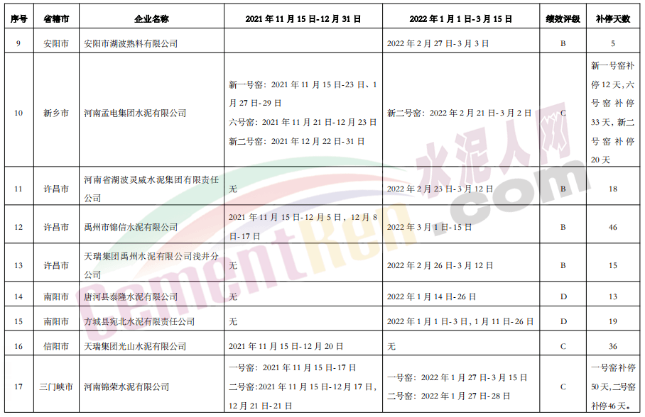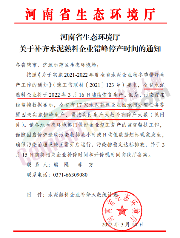 3月14日,河南省生態(tài)環(huán)境廳發(fā)布《關(guān)于補(bǔ)齊水泥熟料企業(yè)錯(cuò)峰停產(chǎn)時(shí)間的通知》稱全省水泥熟料企業(yè)于2022年3月16日陸續(xù)恢復(fù)生產(chǎn)。但是,污染源在線監(jiān)控?cái)?shù)據(jù)顯示,全省有17家水泥熟料企業(yè)因承擔(dān)處置任務(wù)等原因未實(shí)施錯(cuò)峰生產(chǎn),需按實(shí)際生產(chǎn)天數(shù)補(bǔ)齊停產(chǎn)天數(shù)。