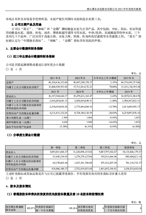3月16日,A股上市公司冀東水泥(代碼:000401.SZ)發(fā)布2021年全年業(yè)績(jī)報(bào)告稱(chēng),2021年1月1日-2021年12月31日,公司實(shí)現(xiàn)營(yíng)業(yè)收入363.38億元,同比增長(zhǎng)2.42%,凈利潤(rùn)28.10億元,同比下降1.40%,基本每股收益為1.77元。