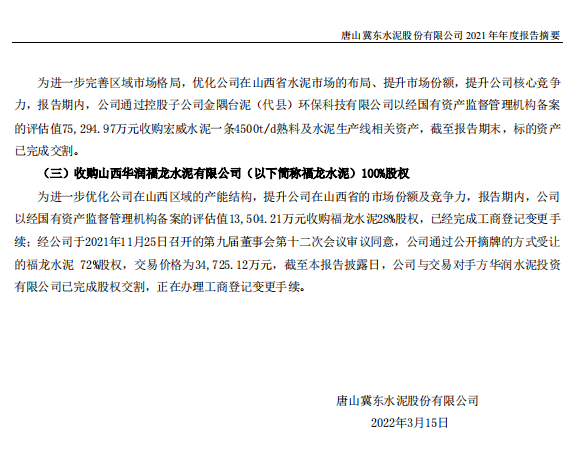 為進(jìn)一步優(yōu)化公司在山西區(qū)域的產(chǎn)能結(jié)構(gòu),提升公司在山西省的市場(chǎng)份額及競(jìng)爭(zhēng)力,報(bào)告期內(nèi),公司以經(jīng)國(guó)有資產(chǎn)監(jiān)督管理機(jī)構(gòu)備案的評(píng)估值13,504.21萬(wàn)元收購(gòu)福龍水泥28%股權(quán),已經(jīng)完成工商登記變更手續(xù);經(jīng)公司于2021年11月25日召開(kāi)的第九屆董事會(huì)第十二次會(huì)議審議同意,公司通過(guò)公開(kāi)摘牌的方式受讓的福龍水泥72%股權(quán),交易價(jià)格為34,725.12萬(wàn)元,截至本報(bào)告披露日,公司與交易對(duì)手方華潤(rùn)水泥投資有限公司已完成股權(quán)交割,正在辦理工商登記變更手續(xù)。