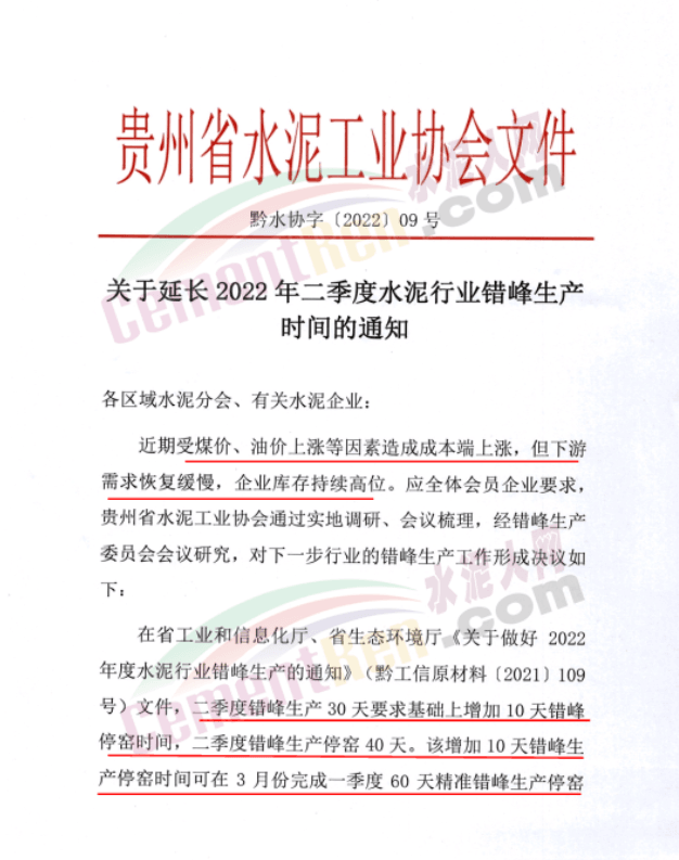 3月16日,貴州省水泥工業(yè)協(xié)會(huì)發(fā)布了《關(guān)于延長(zhǎng)2022年二季度水泥行業(yè)錯(cuò)峰生產(chǎn)時(shí)間的通知》稱,近期受煤價(jià)、油價(jià)上漲等因素造成成本端上漲,但下游需求恢復(fù)緩慢,企業(yè)庫(kù)存持續(xù)高位。應(yīng)企業(yè)要求延長(zhǎng)2022年錯(cuò)峰生產(chǎn)時(shí)間,其中二季度錯(cuò)峰生產(chǎn)30天要求基礎(chǔ)上增加10天錯(cuò)峰停窯時(shí)間,二季度錯(cuò)峰生產(chǎn)停窯 40天。