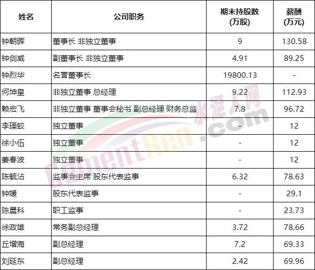 上市公司數(shù)據(jù)庫(kù)數(shù)據(jù)顯示,董事長(zhǎng)鐘鐘朝暉年薪酬130.58萬(wàn)元,副董事長(zhǎng)鐘劍威年薪為89.25萬(wàn)元,總經(jīng)理何坤皇年薪112.93萬(wàn)元,董事會(huì)秘書賴宏飛年薪96.72萬(wàn)元,年薪過(guò)百萬(wàn)高管共2人。