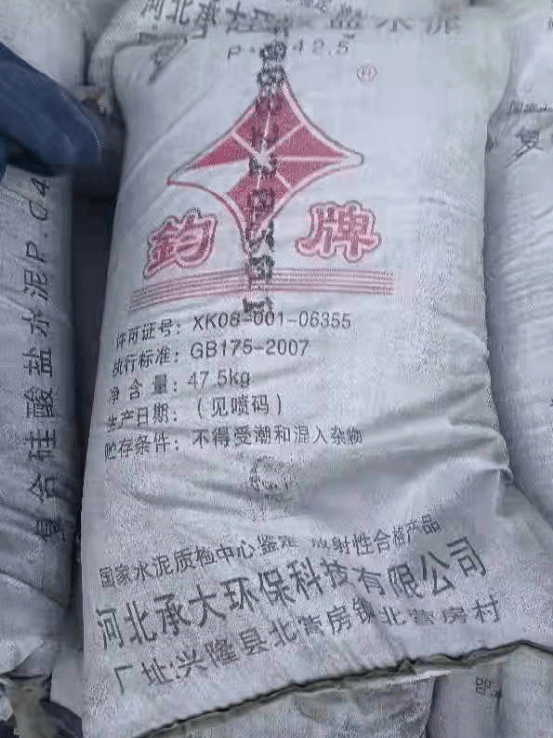 一款42.5水泥,標(biāo)稱生產(chǎn)企業(yè)為河北承大環(huán)??萍加邢薰荆瑑艉?7.5kg。生產(chǎn)許可證編號標(biāo)稱為XK08-001-06355。生產(chǎn)日期噴碼顯示“220301”字樣。