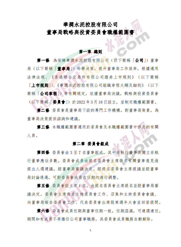 華潤水泥控股公布,自2022年3月18日起,董事局成立戰(zhàn)略與投資委員會,撤銷執(zhí)行委員會,薪酬委員會更名為薪酬與考核委員會,企業(yè)管治委員會更名為風險與合規(guī)委員會。