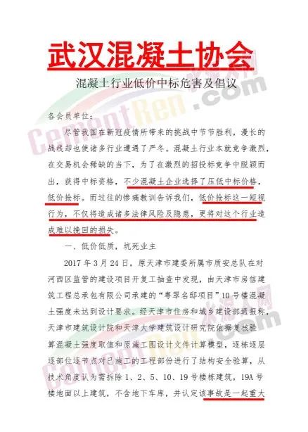 日前,武漢混凝土協(xié)會發(fā)布《混凝土行業(yè)低價中標危害及倡議》給會員單位稱,混凝土行業(yè)本就竟爭激烈,在交易機會稀缺的當下,為了在激烈的招投標競爭中脫穎而出,獲得中標資格,不少混凝土企業(yè)選擇了壓低中標價格,低價搶標。而過往的慘痛教訓告訴我們,低價搶標這一短視行為,不僅將造成諸多法律風險及隱患,更將對這個行業(yè)造成難以挽回的損失。