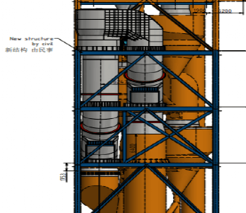 將預(yù)熱器現(xiàn)有的雙旋風(fēng)筒更換成兩個KHD最新一代的C1高效旋風(fēng)筒,以適應(yīng)熟料提產(chǎn)后的要求,改造后示意圖見圖4。
