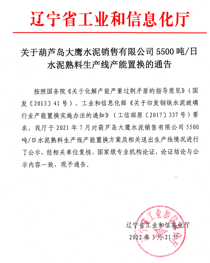 3月22日,遼寧省工信廳發(fā)布《關(guān)于葫蘆島大鷹水泥銷售有限公司5500噸/日水泥熟料生產(chǎn)線產(chǎn)能置換的通告》,葫蘆島大鷹水泥銷售公司將通過退出遼寧大鷹水水泥集團(tuán)和大連永盛水泥制造有限公司4000t/d和3000t/d兩條熟料生產(chǎn)線,用于新建一條5500t/d水泥熟料生產(chǎn)線。并計(jì)劃于2023年8月1日點(diǎn)火投產(chǎn),置換比例1.27:1。