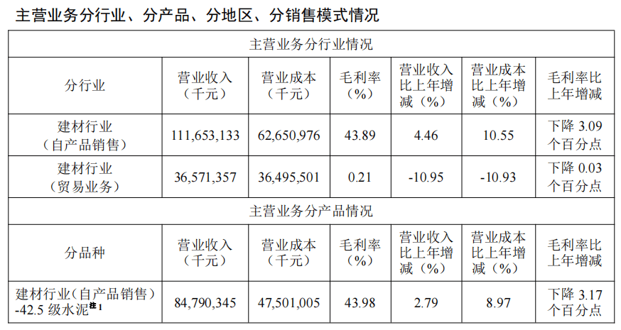 水泥熟料自產(chǎn)品銷量為3.04億噸,同比下降6.53%;自產(chǎn)品銷售收入1,116.53億元,同比增長(zhǎng)4.46%;自產(chǎn)品銷售成本626.51億元,同比上升10.55%;自產(chǎn)品綜合毛利率為43.89%,較上年同期下降3.09個(gè)百分點(diǎn)。