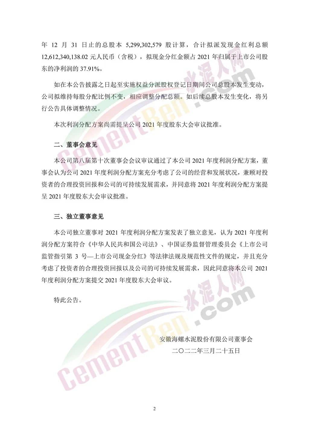 附安徽海螺水泥股份有限公司2021年年度利潤(rùn)分配方案公告