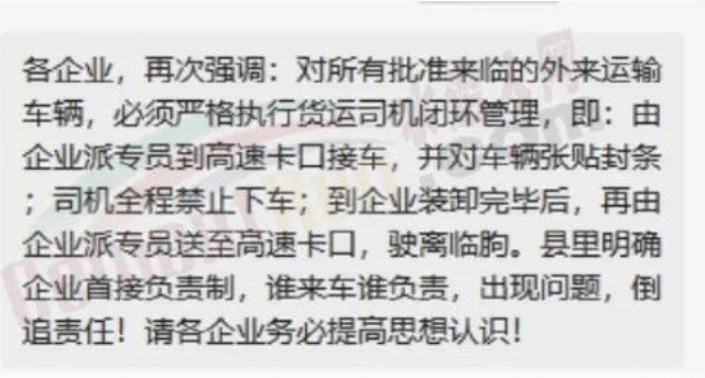 臨朐企業(yè)收到通知強調(diào),對所有批準來臨的外來運輸車輛,必須嚴格執(zhí)行貨運司機閉環(huán)管理,即:由企業(yè)派專員到高速卡口接車,并對車輛張貼封條;司機全程禁止下車;到企業(yè)裝卸完畢后,再由企業(yè)派專員送至高速卡口,駛離臨朐??h里明確企業(yè)首接負責制,誰來車誰負責,出現(xiàn)問題,倒追責任!