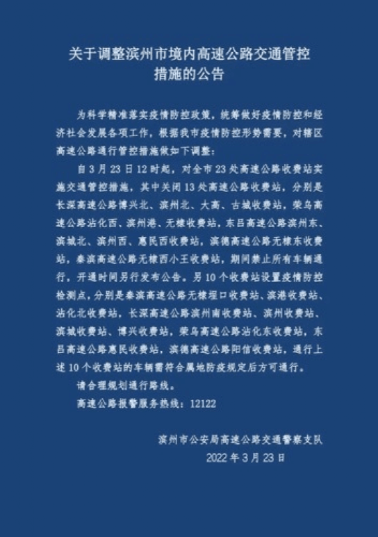 濱州市公安局高速交警支隊通知,自3月23日12時起,對全市23處高速公路收費站實施交通管控措施,其中關閉13 處高速公路收費站,開通時間另行發(fā)布公告。另10個收費站設置疫情防控檢測點,車輛需符合屬地防疫規(guī)定后方可通行。