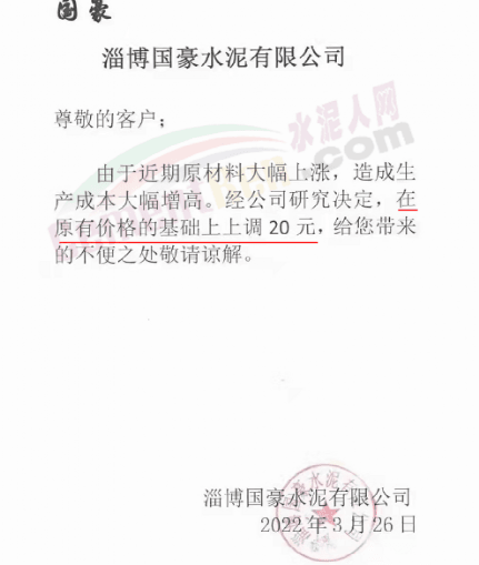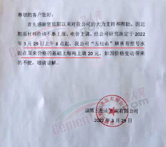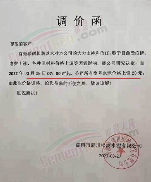 淄博市淄川松嶺水泥有限公司通知,鑒于目前受疫情、電費上漲,各種原材料價格上調(diào)等因素影響,經(jīng)公司研究決定,自3月28日7時起,公司所有型號水泥價格上調(diào)20元/噸。