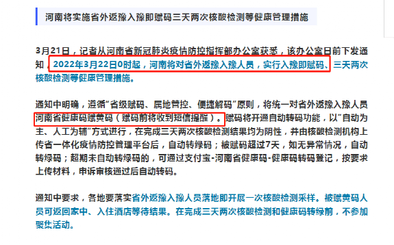 據(jù)了解,河南省新冠肺炎疫情防控指揮部辦公室近期曾下發(fā)通知,自3月22日0時起對省外返豫入豫人員,實行入豫即賦黃碼,三天兩檢等健康管理措施。