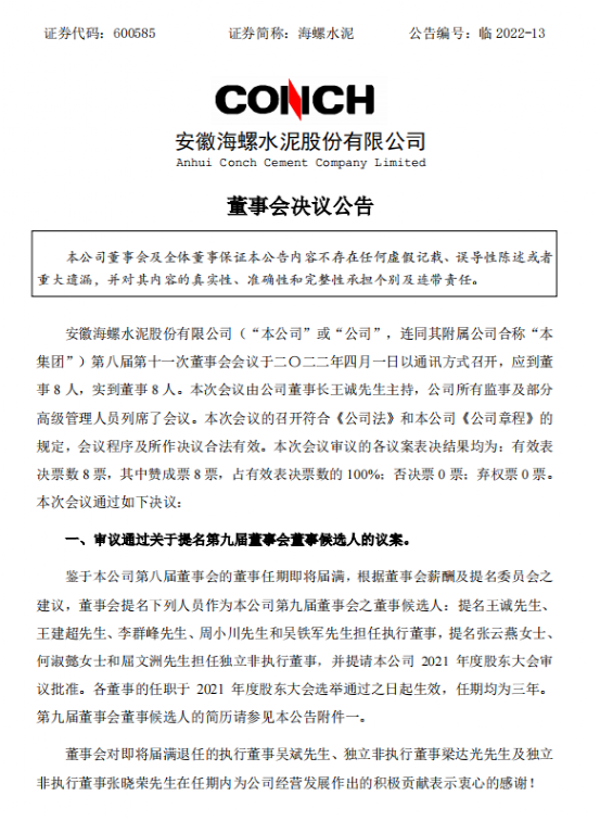 日前,海螺水泥發(fā)布公告稱,安徽海螺水泥股份有限公司第八屆第十一次董事會審議通過關(guān)于提名第九屆董事會董事候選人的議案。根據(jù)董事會薪酬及提名委員會之建議,董事會提名王誠先生、王建超先生、李群峰先生、周小川先生和吳鐵軍先生擔(dān)任執(zhí)行董事,提名張云燕女士、何淑懿女士和屈文洲先生擔(dān)任第九屆董事會獨立非執(zhí)行董事。各董事的任職于2021年度股東大會選舉通過之日起生效,任期均為三年。