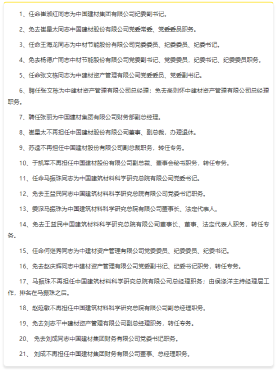 1月初,中國建材集團(tuán)有限公司發(fā)布數(shù)十條高層任免通知,對中國建材部分高層職務(wù)進(jìn)行了重新任免。