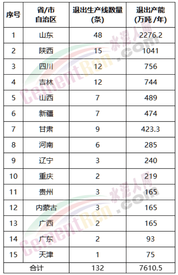 據(jù)各地工信廳2022年以來公示公告消息以及各區(qū)域截止2021年底公示產(chǎn)能清單數(shù)據(jù),山東、陜西、甘肅、貴州、四川、重慶、天津、山西、內(nèi)蒙古、新疆、遼寧、吉林、河南、廣東、廣西等15個省市自治區(qū)明確拆除、擬拆除退出132條熟料生產(chǎn)線,合計退出產(chǎn)能達7610.5萬噸/年。