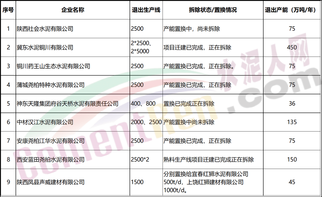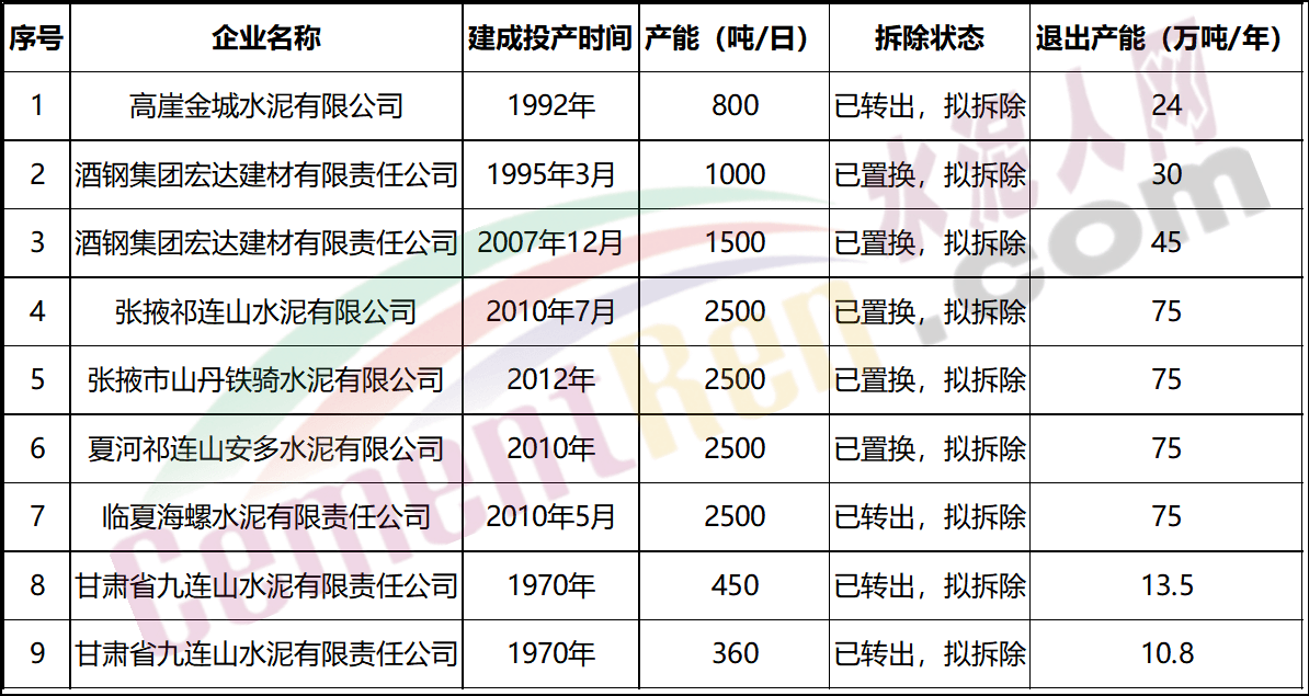 甘肅已置換轉出,擬拆除產(chǎn)能423.3萬噸/年,共9條熟料生產(chǎn)線