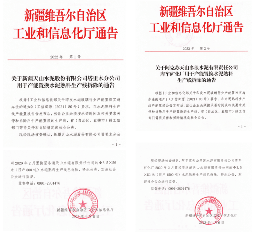 新疆自治區(qū)工信廳1月6日公告,天山水泥兩條熟料生產(chǎn)線合計2300t/d產(chǎn)能已拆除退出。