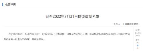 日前,上海票交所發(fā)布《截至2022年3月31日持續(xù)逾期名單》通知公告稱,2021年10月1日至2022年3月31日出現(xiàn)3次以上付款逾期,且截至2022年3月31日有逾期余額或2022年3月當月出現(xiàn)付款逾期的承兌人數(shù)量為1904家。