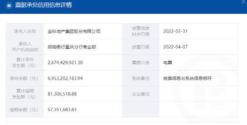 金科地產集團的票據(jù)承兌信用信息詳情顯示, 累計逾期發(fā)生額約8130.66萬元,逾期余額約5735.17萬元。