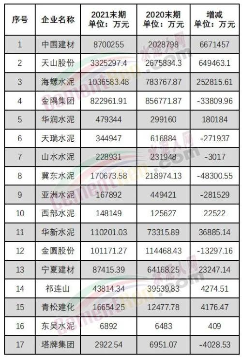 據(jù)水泥人網不完全統(tǒng)計,水泥行業(yè)17家上市公司,2021年末期應收票據(jù)和賬款“10增7減”。其中中國建材、天山股份、海螺水泥、華潤水泥、華新水泥、寧夏建材、西部水泥、祁連山、青松建化、東吳水泥等10家企業(yè)較上年同期均有增長。山水水泥、塔牌集團、金圓股份、金隅集團、冀東水泥、天瑞水泥、亞洲水泥7家企業(yè)有所減少。