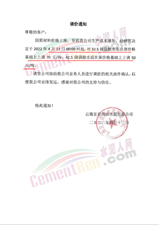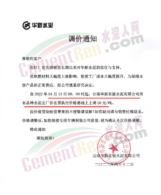 云南澄江華榮水泥通知,4月13日0時(shí)對(duì)所有區(qū)域所有品種水泥上調(diào)50元/噸。