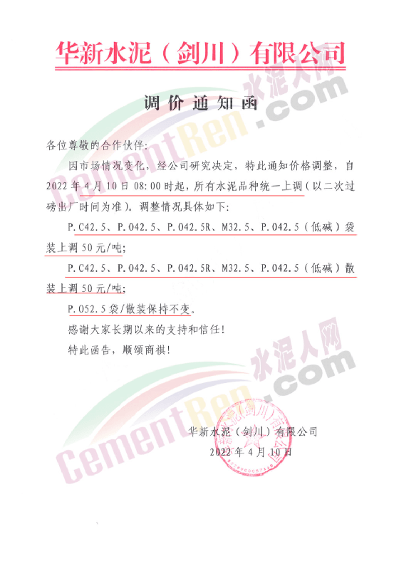 華新水泥(劍川)有限公司通知因市場情況變化,經(jīng)公司研究決定自4月10日8時(shí)起,32.5級(jí)和42.5級(jí)所有品種水泥上調(diào)50元/噸。