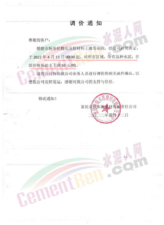 富民金銳水泥建材有限責(zé)任公司通知,自4月13日0時(shí)起,對(duì)所有區(qū)域,所有品牌水泥價(jià)格上調(diào)50元/噸。