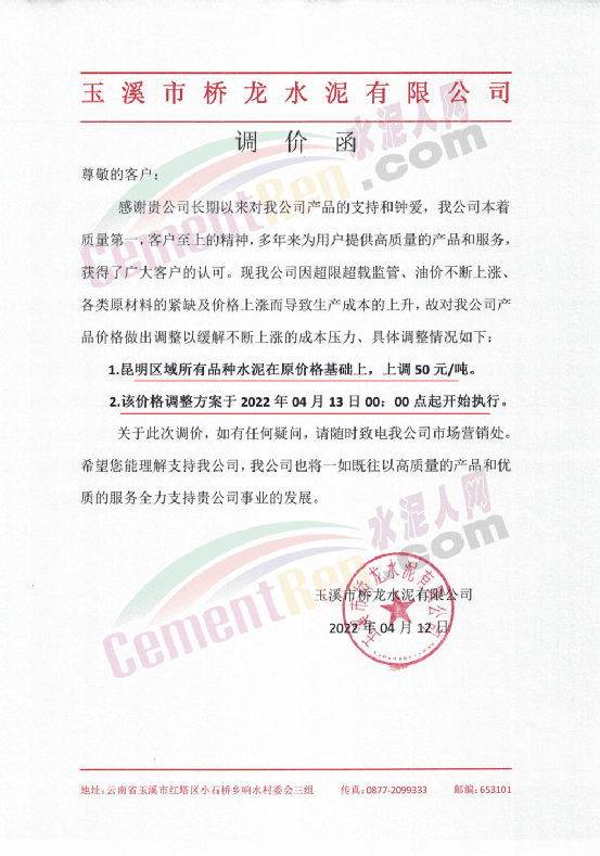 玉溪市橋龍水泥有限公司通知,因超限超載監(jiān)管、油價(jià)不斷上漲、各類原材料的緊缺及價(jià)格上漲而導(dǎo)致生產(chǎn)成本的上升,為緩解不斷上漲的成本壓力,自4月13日0時(shí)起公司昆明區(qū)域所有品種水泥價(jià)格上調(diào)50元/噸。