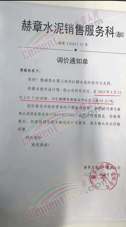 同期,位于貴州區(qū)域赫章水泥廠通知根據(jù)當(dāng)前市場行情經(jīng)公司研究決定,自4月13日上午7時(shí)起,對(duì)紅獅牌各規(guī)格品種水泥上調(diào)60元/噸,上調(diào)后P.O42.5水泥出廠報(bào)價(jià)400元/噸。