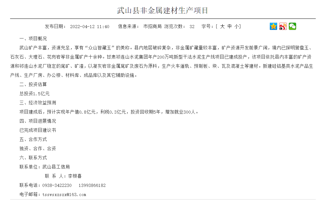 日前,甘肅天水市招商局發(fā)布了《武山縣非金屬建材生產(chǎn)項(xiàng)目》招商引資推介項(xiàng)目消息稱,甘肅祁連山水泥集團(tuán)年產(chǎn)200萬噸新型干法水泥生產(chǎn)線項(xiàng)目已建成投產(chǎn),該項(xiàng)目依托縣內(nèi)豐富的礦產(chǎn)資源和祁連山水泥廠穩(wěn)定的尾礦、礦渣,以凝灰?guī)r非金屬尾礦及廢石為原料,生產(chǎn)火車道軌、預(yù)制板、塊、瓦及混凝土等建材。新建硅鋁基類水泥產(chǎn)品生產(chǎn)線、生產(chǎn)廠房、辦公樓、材料庫、成品庫以及其它輔助設(shè)施。