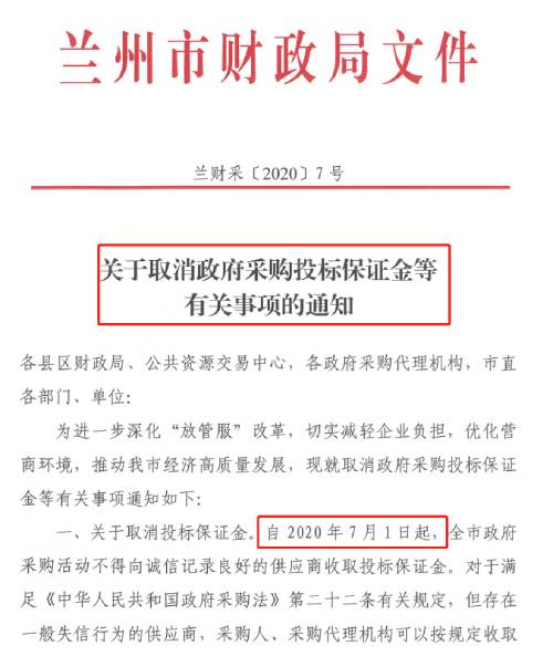 蘭州:自2020年7月1日起,取消政府采購?fù)稑?biāo)保證金。