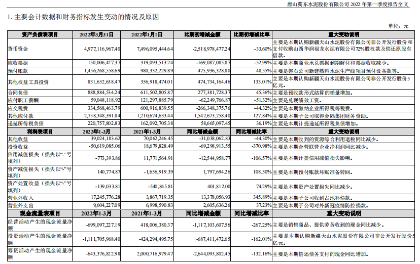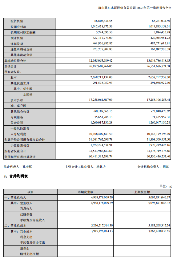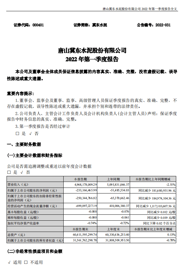 冀東水泥于2022年4月20日披露一季報(bào),公司2022年一季度實(shí)現(xiàn)營(yíng)業(yè)總收入49.7億,同比下降2.5%;實(shí)現(xiàn)歸母凈利潤(rùn)-2.3億,上年同期為-5148.6萬(wàn)元,虧損幅度擴(kuò)大。