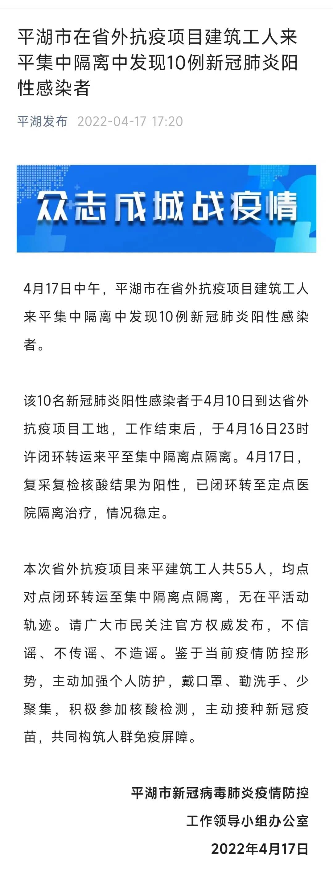 本次省外抗疫項(xiàng)目來平建筑工人共55人,均點(diǎn)對(duì)點(diǎn)閉環(huán)轉(zhuǎn)運(yùn)至集中隔離點(diǎn)隔離,無在平活動(dòng)軌跡。請(qǐng)廣大市民關(guān)注官方權(quán)威發(fā)布,不信謠、不傳謠、不造謠。鑒于當(dāng)前疫情防控形勢(shì),主動(dòng)加強(qiáng)個(gè)人防護(hù),戴口罩、勤洗手、少聚集,積極參加核酸檢測(cè),主動(dòng)接種新冠疫苗,共同構(gòu)筑人群免疫屏障。