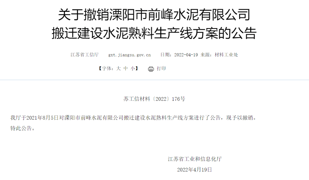 4月19日,江蘇省工信廳發(fā)布《關于撤銷溧陽市前峰水泥有限公司搬遷建設水泥熟料生產(chǎn)線方案的公告》稱,江蘇省工信廳于2021年8月5日對溧陽市前峰水泥有限公司搬遷建設水泥熟料生產(chǎn)線方案進行了公告,現(xiàn)予以撤銷。