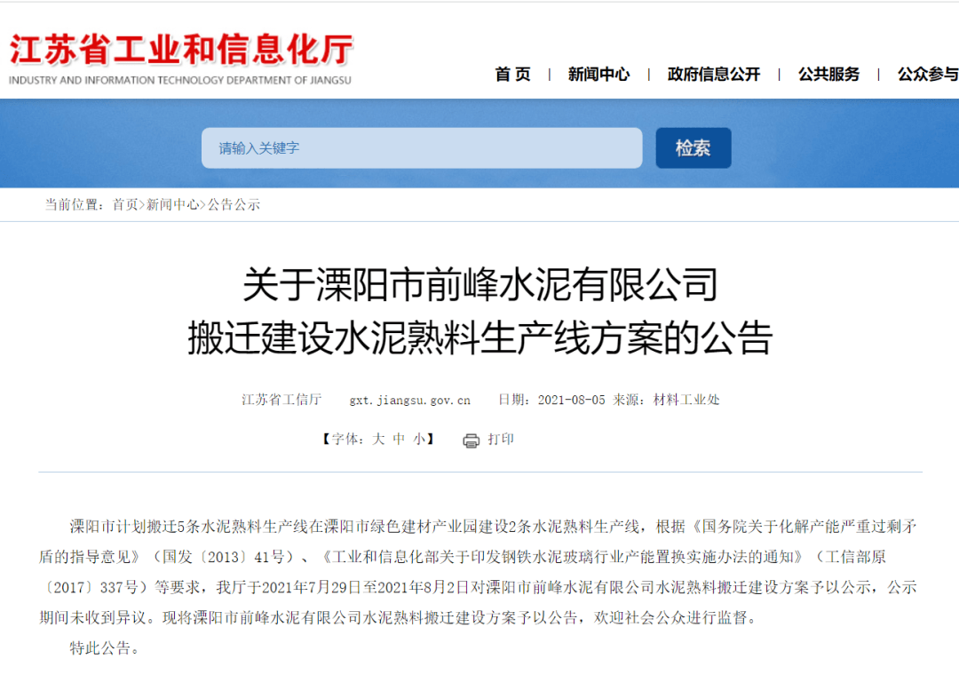 江蘇省工信廳2021年8月5日公告顯示,溧陽市計劃搬遷5條水泥熟料生產(chǎn)線在溧陽市綠色建材產(chǎn)業(yè)園建設兩條水泥熟料生產(chǎn)線。根據(jù)相關文件要求,江蘇省工信廳于2021年7月29日至2021年8月2日對溧陽市前峰水泥有限公司水泥熟料搬遷建設方案予以公示,公示期間未收到異議。并將溧陽市前峰水泥有限公司水泥熟料搬遷建設方案予以公告,歡迎社會公眾進行監(jiān)督。