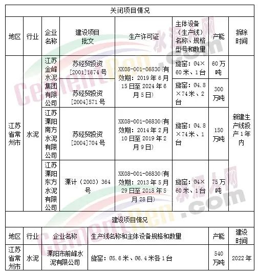 公告附件可見,關閉項目包括江蘇金峰水泥集團3條熟料生產(chǎn)線,江蘇溧陽南方水泥1條熟料生產(chǎn)線以及溧陽東方水泥1條熟料生產(chǎn)線。