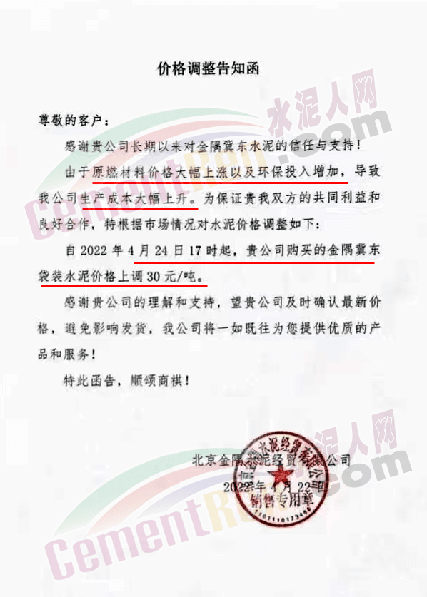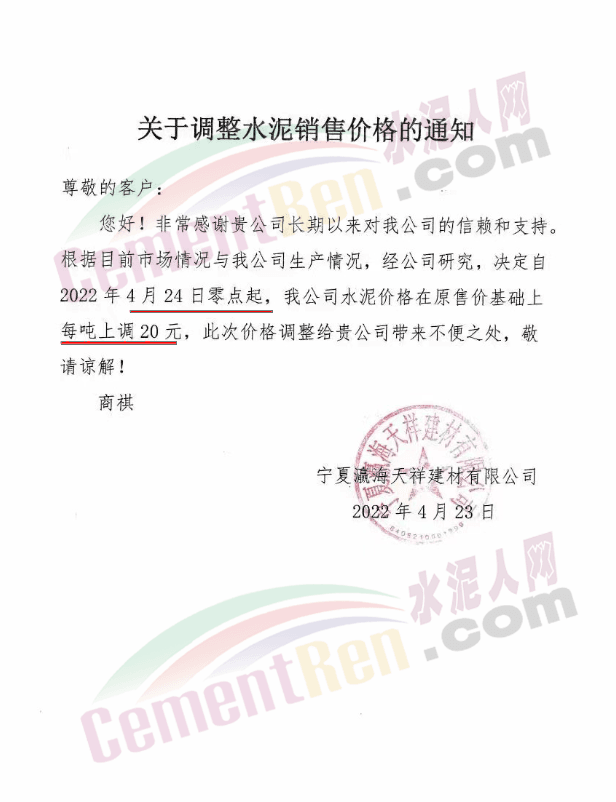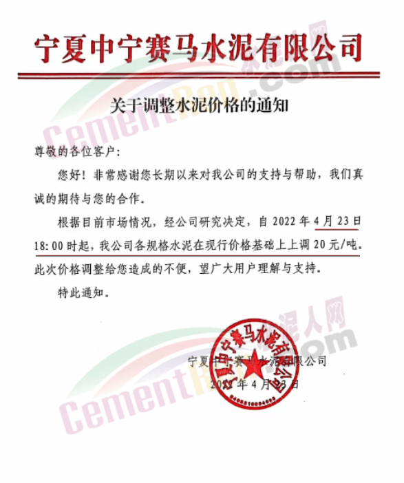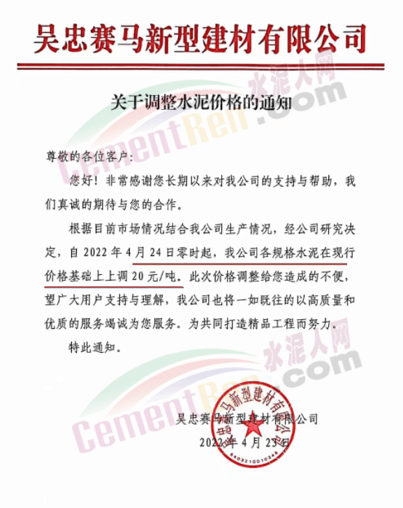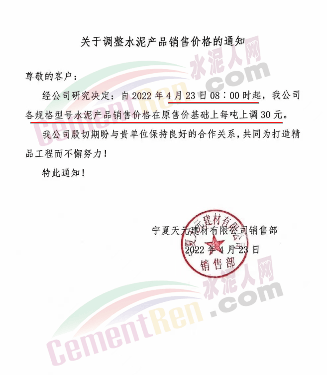 寧夏天元建材有限公司銷售部通知,自2022年4月23日8時(shí)起,公司各規(guī)格型號水泥產(chǎn)品銷售價(jià)格在原售價(jià)基礎(chǔ)上每噸上調(diào)30元。
