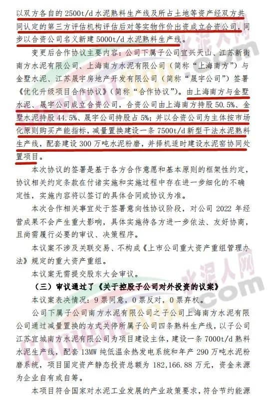變更后合作協(xié)議主要內容:公司下屬子公司宜興天山、江蘇新街南方水泥有限公司、上海南方水泥有限公司(簡稱“上海南方”)與金墅水泥、江蘇晟宇房地產開發(fā)有限公司(簡稱“晟宇公司”)簽署《優(yōu)化升級項目合作協(xié)議》(簡稱“合作協(xié)議”)。由上海南方與金墅水泥、晟宇公司成立合資公司,合資公司由上海南方持股 50.5%、金墅水泥持股 44.5%、晟宇公司持股占 5%;并以合資公司為主體按市場化原則購買產能指標,減量置換建設一條 7500t/d 新型干法水泥熟料生產線,配套建設 300 萬噸水泥粉磨,并擇機適時建設水泥窯協(xié)同處置項目。具體公告如下: