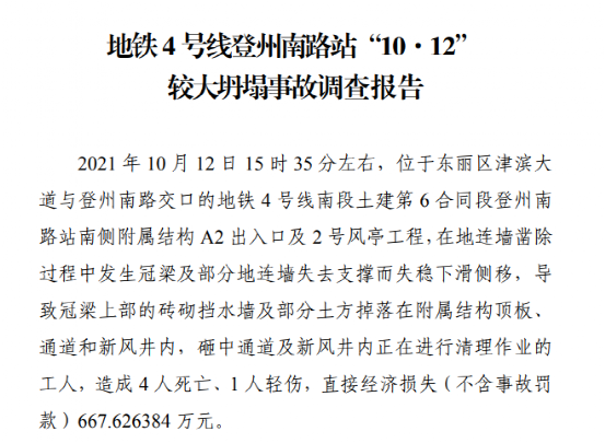 日前,天津市應急管理局發(fā)布《地鐵4號線登州南路站“10·12”較大坍塌事故調(diào)查報告》提到,2021年10月12日天津地鐵4號線南段的一處在建工程發(fā)生坍塌導致4人死亡的事故。