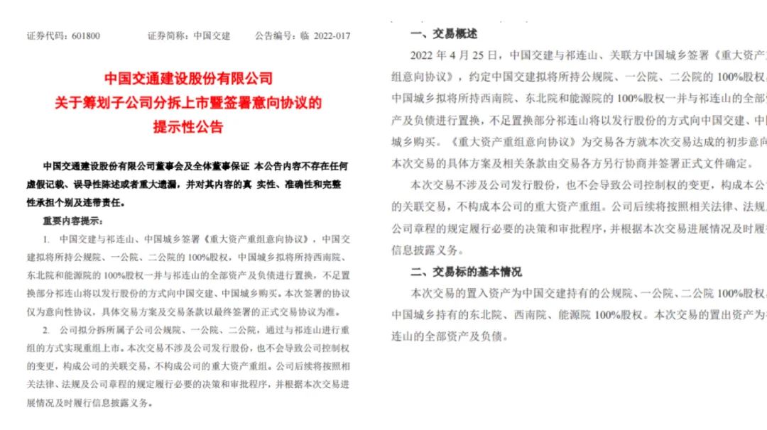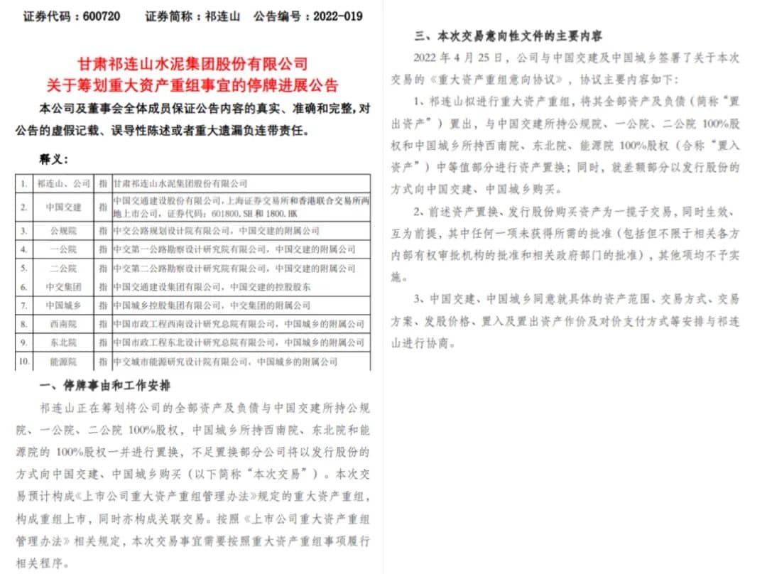 當(dāng)日中國建材發(fā)布公告稱,于2022年4月25日,祁連山與中國交通建設(shè)股份有限公司及中國城鄉(xiāng)控股集團(tuán)有限公司簽訂了一份合作意向書,有關(guān)一項資產(chǎn)置換及發(fā)行股份,擬由祁連山通過其全部資產(chǎn)及負(fù)債置換及就置出標(biāo)的資產(chǎn)的價值與置入標(biāo)的資產(chǎn)的價值差額部分發(fā)行股份作為對價購買中國交建及中國城鄉(xiāng)持有的其六個標(biāo)的公司100%股權(quán)等資產(chǎn)。建議資產(chǎn)重組完成后,預(yù)期祁連山將不再為公司的附屬公司。
