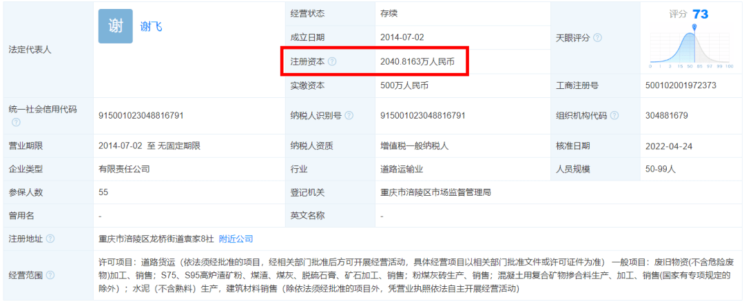 天眼查查詢結果顯示,重慶市多吉再生資源有限公司,成立于2014-07-02,注冊資本為2040.8163萬人民幣,法定代表人為謝飛,經營狀態(tài)為存續(xù),工商注冊號為500102001972373,注冊地址為重慶市涪陵區(qū)龍橋街道袁家8社,經營范圍包括許可項目:道路貨運(依法須經批準的項目,經相關部門批準后方可開展經營活動,具體經營項目以相關部門批準文件或許可證件為準) 一般項目:廢舊物資(不含危險廢物)加工、銷售;S75、S95高爐渣礦粉、煤渣、煤灰、脫硫石膏、礦石加工、銷售;粉煤灰磚生產、銷售;混凝土用復合礦物摻合料生產、加工、銷售(國家有專項規(guī)定的除外);水泥(不含熟料)生產,建筑材料銷售(除依法須經批準的項目外,憑營業(yè)執(zhí)照依法自主開展經營活動)。