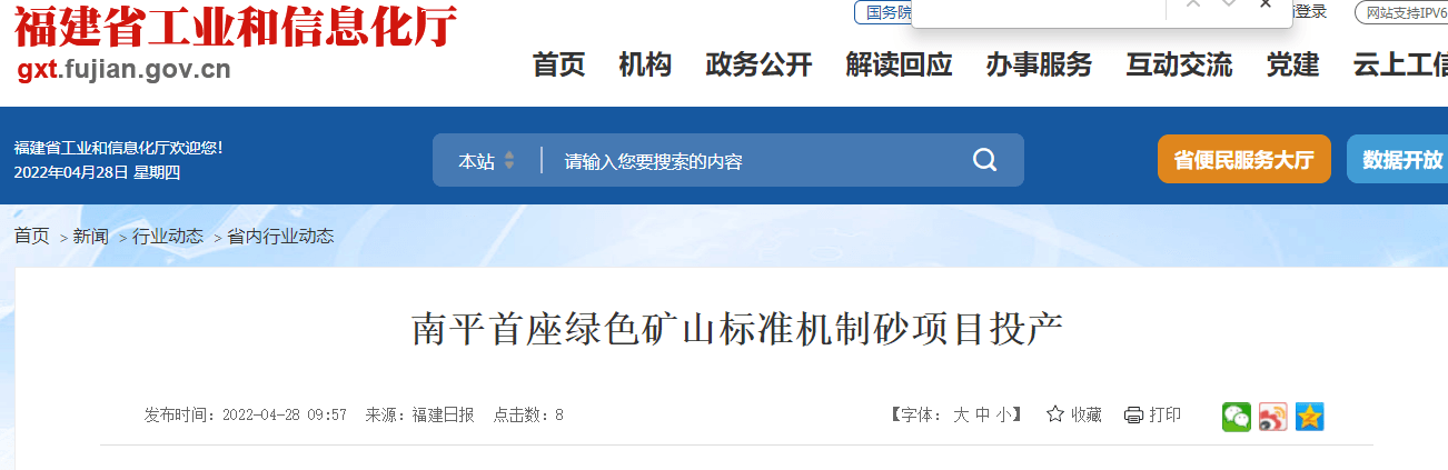 近日,在南平市建陽區(qū)麻沙鎮(zhèn),井窠建筑用凝灰?guī)r(機制砂)項目通過驗收并投產(chǎn)。該項目是南平第一座按照綠色礦山標準執(zhí)行設(shè)計、建設(shè)的機制砂生產(chǎn)項目,預(yù)計年產(chǎn)碎石、機制砂150萬噸。