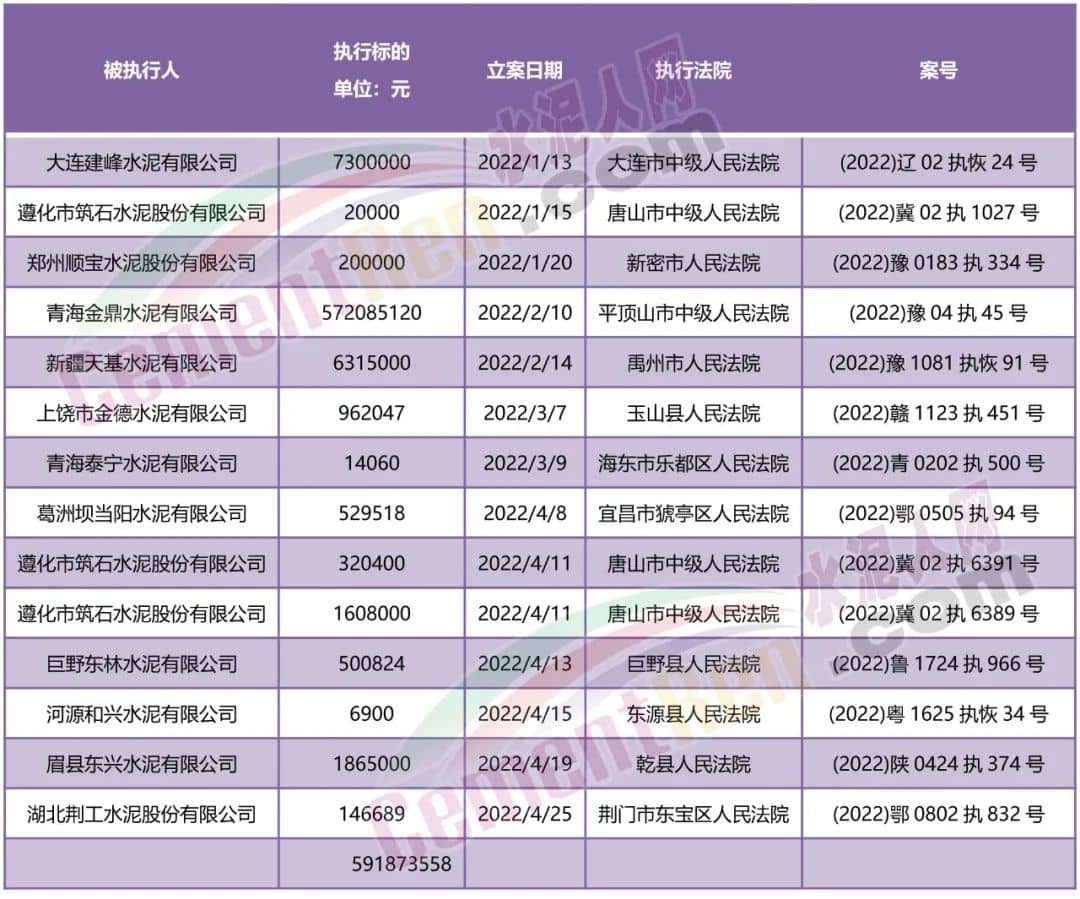 據(jù)相關(guān)數(shù)據(jù)顯示,今年以來涉及司法風(fēng)險被執(zhí)行標(biāo)的的水泥公司共有12家,執(zhí)行標(biāo)的合計(jì)金額約5.92億。