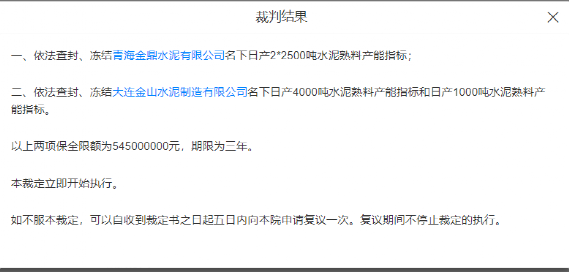 水泥人網(wǎng)注意到,河南省瑞象物資貿(mào)易有限公司與青海金鼎水泥有限公司,大連金山水泥制造有限公司相關(guān)債權(quán)轉(zhuǎn)讓合同糾紛民事裁定書裁定結(jié)果顯示青海金鼎水泥有限公司名下日產(chǎn)2*2500噸水泥熟料產(chǎn)能指標(biāo)被依法查封、凍結(jié);被大連金山水泥制造有限公司名下日產(chǎn)4000噸水泥熟料產(chǎn)能指標(biāo)和日產(chǎn)1000噸水泥熟料產(chǎn)能指標(biāo),被依法查封、凍結(jié)。以上兩項(xiàng)保全限額為545000000元,期限為三年。