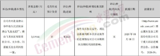 冀東裝備以唐山飛龍水泥廠、唐山飛龍水泥有限責(zé)任公司、唐山飛龍水泥廠投資人王少忠、閆素敏為被告向唐山市中級人民法院提起訴訟,要求唐山飛龍水泥廠支付合同款及違約金等共計(jì)36,196,612.86元;2020年8月27日,冀東裝備已向法院申請強(qiáng)制執(zhí)行。