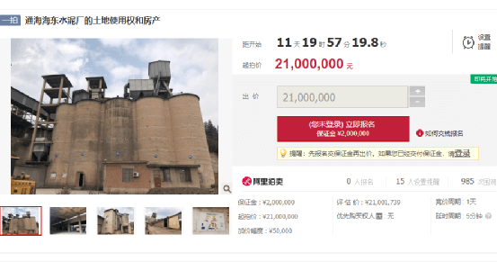 來自阿里拍賣頻道的信息可見,即將開始的拍賣項目中涉及三家水泥企業(yè)機械設備或房產及土地使用權等拍賣。值得注意的三條拍賣信息圍觀人數(shù)幾千人,報名人數(shù)均為“0”。
