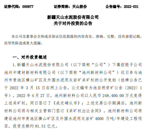 日前,天山股份發(fā)布公告稱,子公司池州新材料公司成功競(jìng)得貴池區(qū)橫山礦區(qū)及外圍水泥用灰?guī)r礦采礦權(quán),并將投資91.51億元建設(shè)水泥用灰?guī)r礦4000萬(wàn)噸/年建設(shè)工程項(xiàng)目。池州新材料公司建設(shè)項(xiàng)目?jī)?nèi)容為“年產(chǎn)4000萬(wàn)噸礦產(chǎn)品加工生產(chǎn)線及配套礦產(chǎn)品運(yùn)輸廊道”。此將投資將進(jìn)一步發(fā)展骨料業(yè)務(wù),優(yōu)化公司沿長(zhǎng)江經(jīng)濟(jì)帶投資布局,促進(jìn)長(zhǎng)三角核心區(qū)建設(shè)。