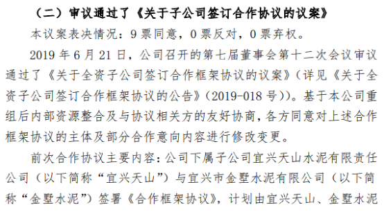 其一為公司下屬子公司宜興天山、江蘇新街南方水泥有限公司、上海南方水泥有限公司(簡(jiǎn)稱“上海南方”)與金墅水泥、江蘇晟宇房地產(chǎn)開(kāi)發(fā)有限公司簽署《優(yōu)化升級(jí)項(xiàng)目合作協(xié)議》。由上海南方與金墅水泥、晟宇公司成立合資公司,合資公司由上海南方持股 50.5%、金墅水泥持股 44.5%、晟宇公司持股占 5%;并以合資公司為主體按市場(chǎng)化原則購(gòu)買產(chǎn)能指標(biāo),減量置換建設(shè)一條 7500t/d 新型干法水泥熟料生產(chǎn)線,配套建設(shè) 300 萬(wàn)噸水泥粉磨,并擇機(jī)適時(shí)建設(shè)水泥窯協(xié)同處置項(xiàng)目。