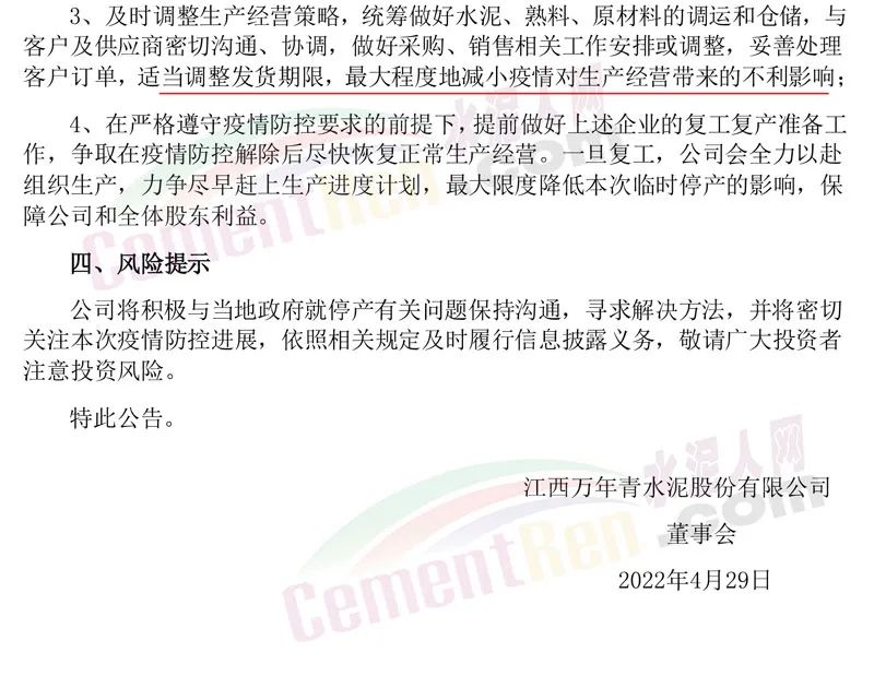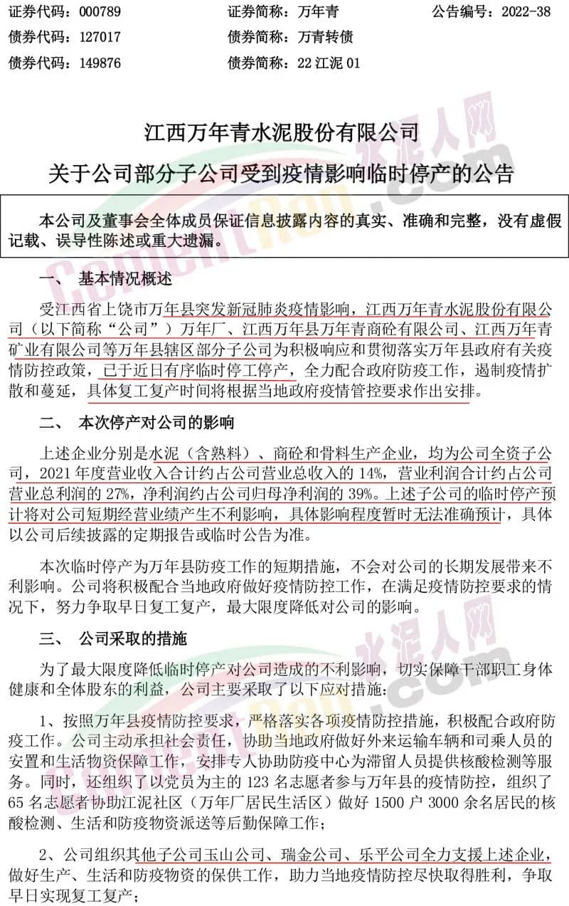 上述企業(yè)分別是水泥(含熟料)、商砼和骨料生產(chǎn)企業(yè),均為公司全資子公司,2021年度營業(yè)收入合計約占公司營業(yè)總收入的14%,營業(yè)利潤合計約占公司營業(yè)總利潤的27%,凈利潤約占公司歸母凈利潤的39%。上述子公司的臨時停產(chǎn)預(yù)計將對公司短期經(jīng)營業(yè)績產(chǎn)生不利影響,具體影響程度暫時無法準(zhǔn)確預(yù)計,具體以公司后續(xù)披露的定期報告或臨時公告為準(zhǔn)。